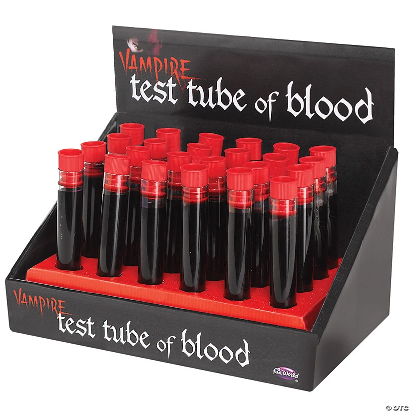 Great for impulse buys for your Halloween store. People never have enough blood for Halloween. This 24 piece counter display will be great for those who need just that little bit more. 24 capped vials of blood.