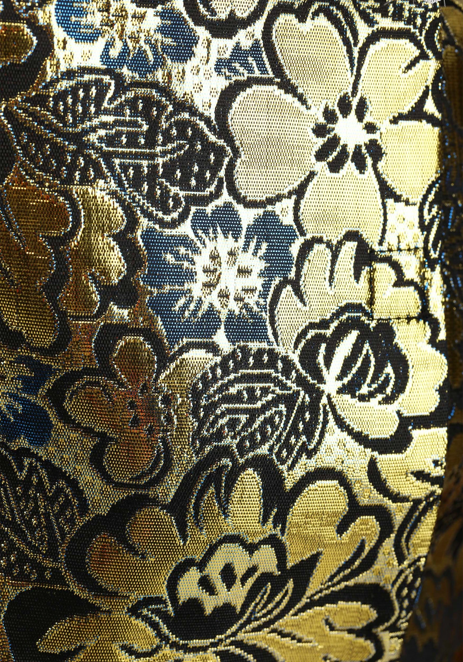 - Sleeveless metallic brocade vest has hook & loop fastener at center front