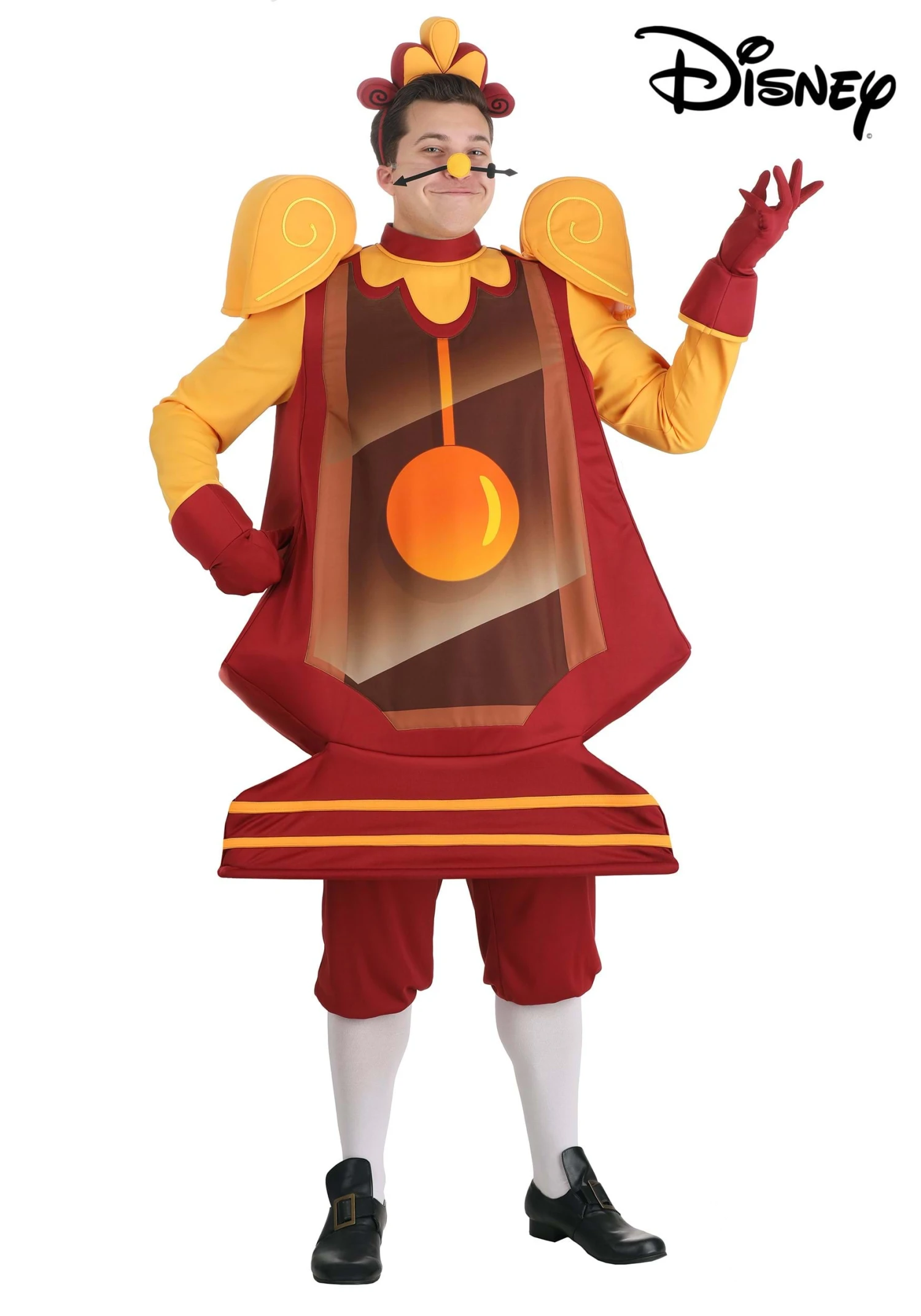 Tell the tale of Cogsworth by stepping into this officially licensed Cogsworth costume from Disney’s Beauty and the Beast. The brown tunic features golden accents on the shoulders and a printed look on the belly, covered with clear vinyl to give you the genuine pendulum clock style of Cogsworth. It fastens with hook and loops and includes matching gloves to maintain the wooden look. The headpiece has foam backing to hold its shape. We’ve even got a sticky felt nose, so all you’ll need to do is draw a couple of extra clock hands to complete your look! Team up with your best buddy Lumiere and you’ll help the Beast find his true love in no time.