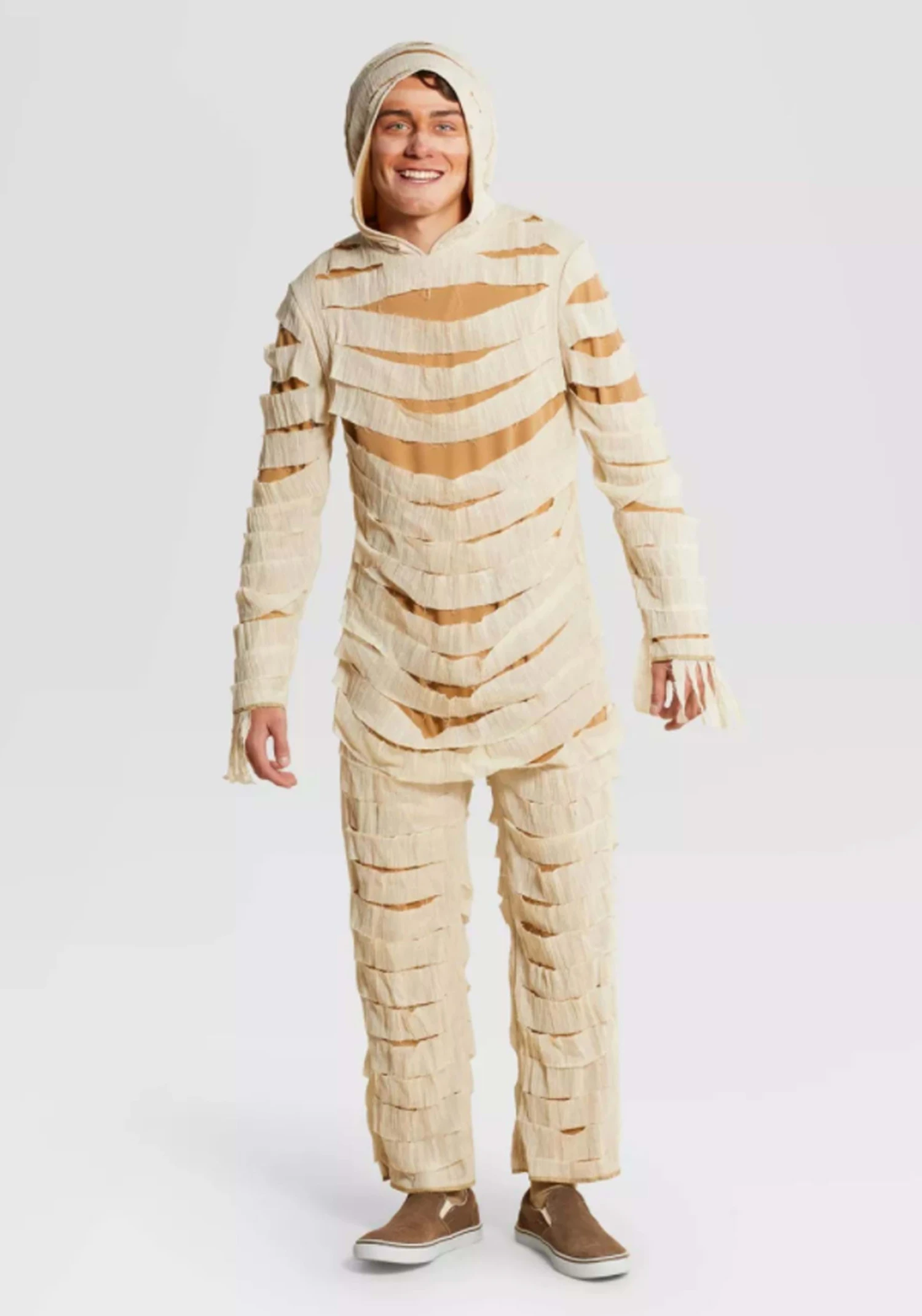 Pharaoh lives again in this Crypt Mummy Costume for Adults! The tan-colored jumpsuit features raggedy bandages wrapped around the torso and arms. Shredded wrapping material dangles from the sleeves. The attached hood also has bandage detail and hides the places where the embalmer sucked out your brains (yep, brains were thought to be useless organs back in Ancient Egypt).