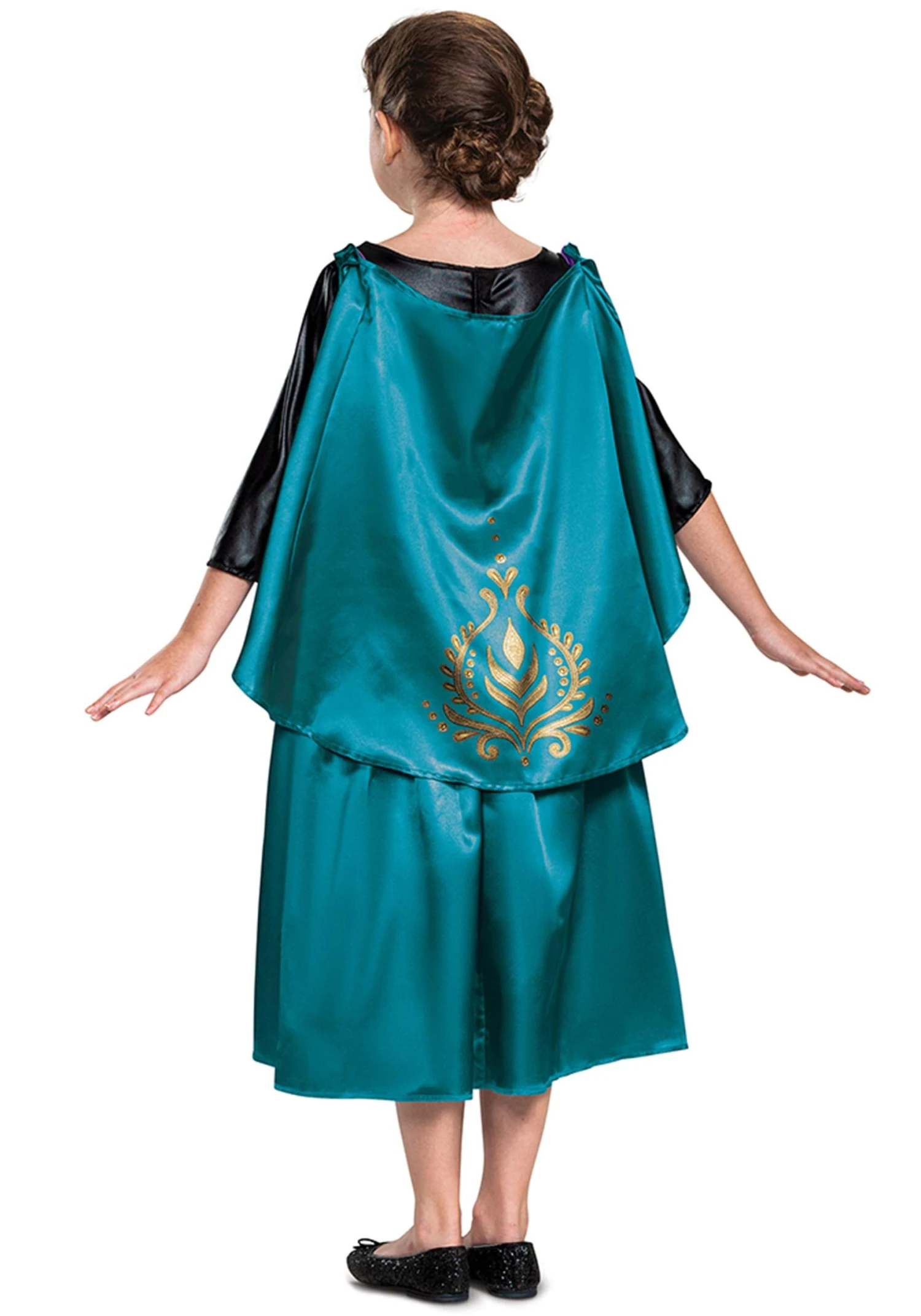 This classic costume is officially licensed and will instantly transform your little princess into Queen Anna of Arendelle! It’s a teal dress with a square neckline, 3/4-length sleeves, printed details, and a satin skirt, all in Anna’s signature teal hue. The dress secures via an easy hook and loop closure in the back. The cape attaches to the dress at the shoulders and looks just like Anna’s. The medallion at the waist gives it that perfect final touch!