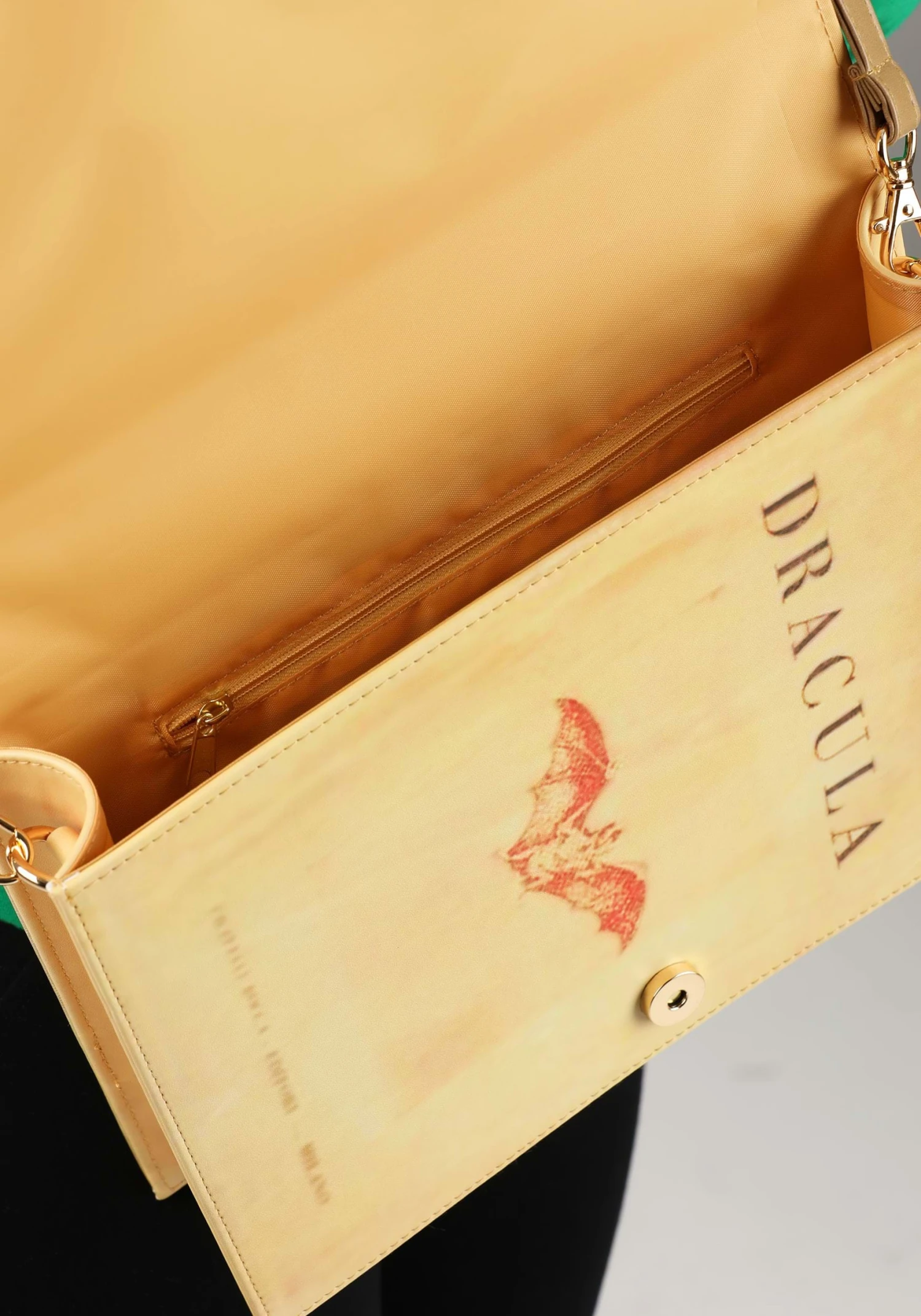 Show your love of the original horror story with this Dracula Book Shaped Bag! The rectangular, dusty yellow purse is shaped like a thick novel and printed with graphics that resemble a vintage Bram Stoker novel. The included strap is length-adjustable.