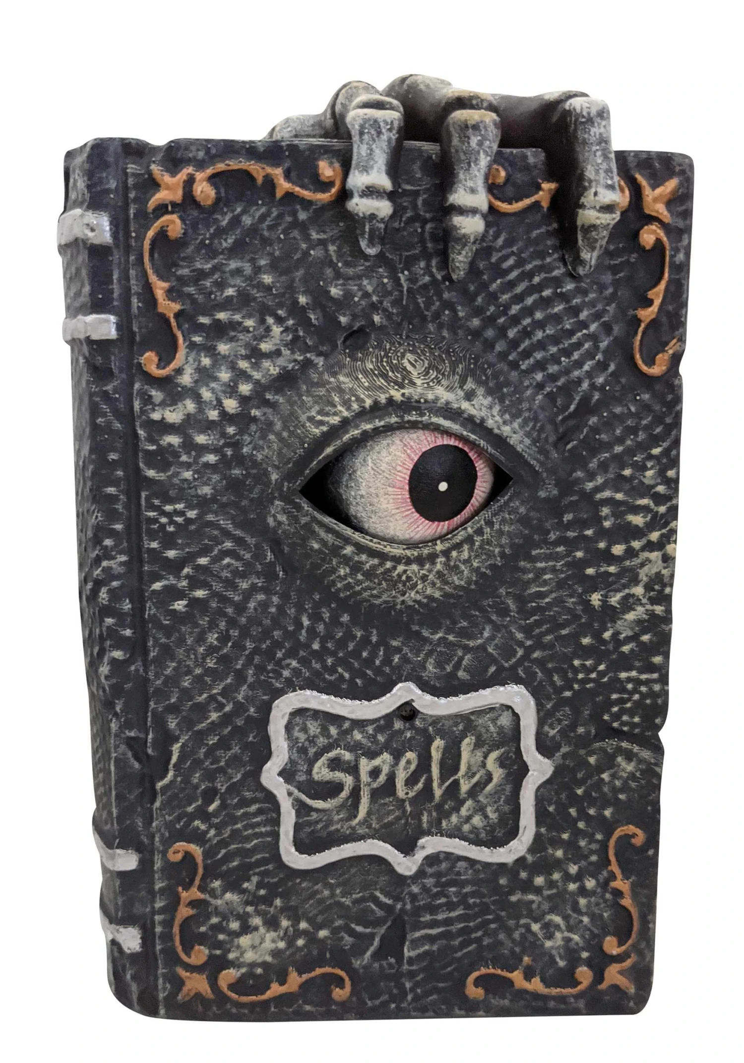 This animatronic spellbook is sure to make a unique centerpiece for your Halloween display! The surface is textured to look like the book was bound with the skin of some great beast. It’s held closed by what we can only imagine is some long-dead wizard’s hand. 3 AA batteries make the strange eye move, sending shouts and shivers to whoever might believe they can pry the magic secrets from this book’s pages!
