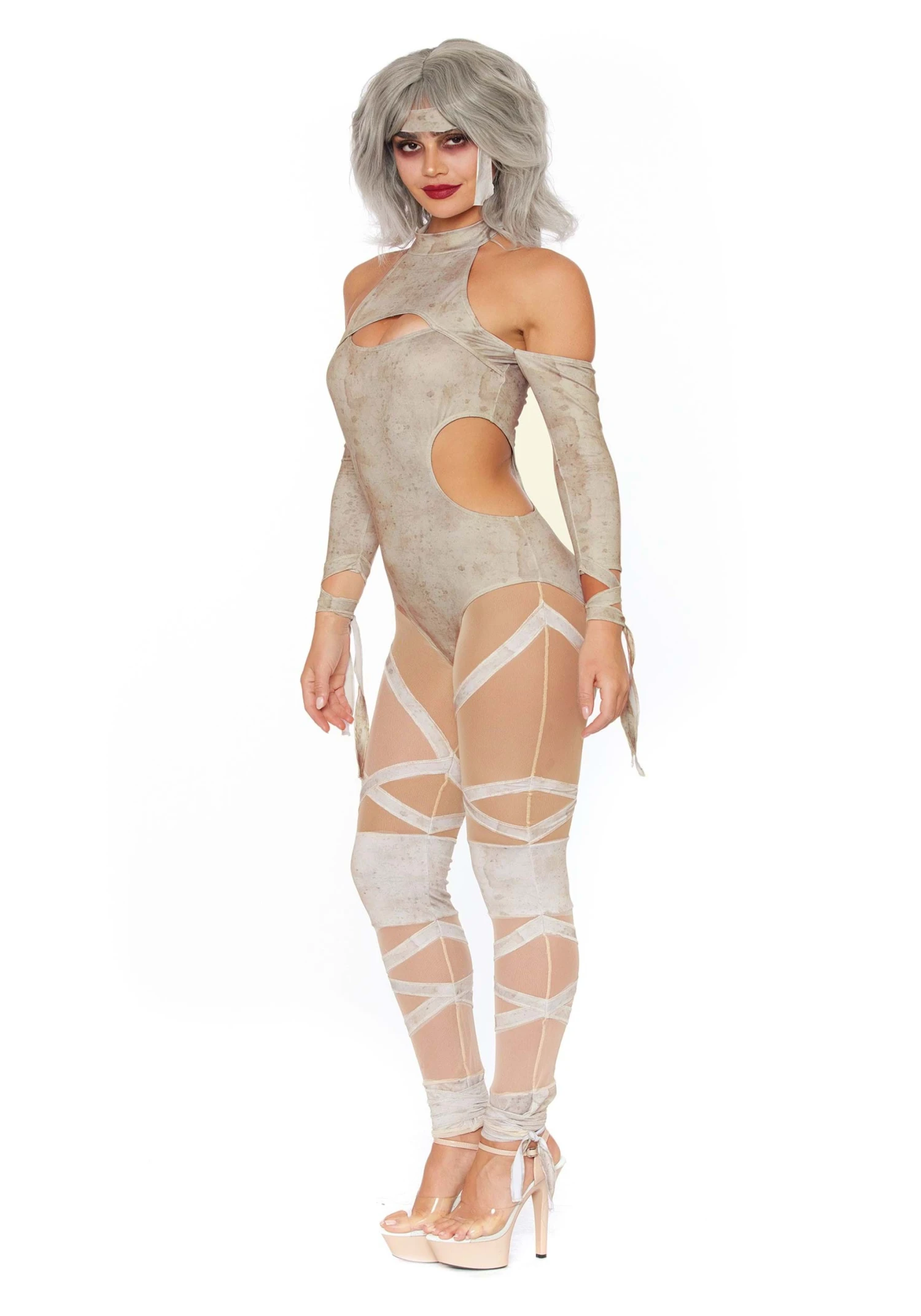 This sexy mummy costume features a one-piece with a cut-away high neckline that zips up the back. Cutaway panels flaunt a bare waistline and continue the wrapped look. The bodysuit is accompanied by detached wrap sleeves and easy-to-slip-on-leg wraps.