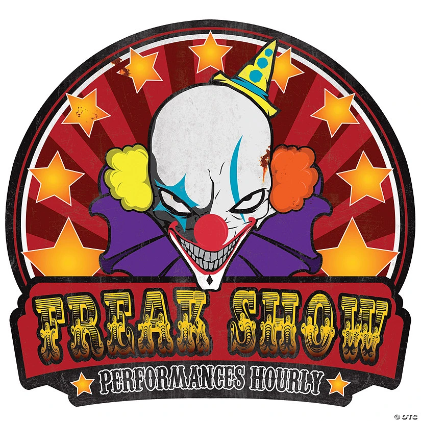 A great sign for your haunted house, home haunt display or even a great Halloween party! Sign shows demented looking clown on colorful background and says “Freak Show – Performances Hourly. Approximately 21.5″ long and 23” wide.