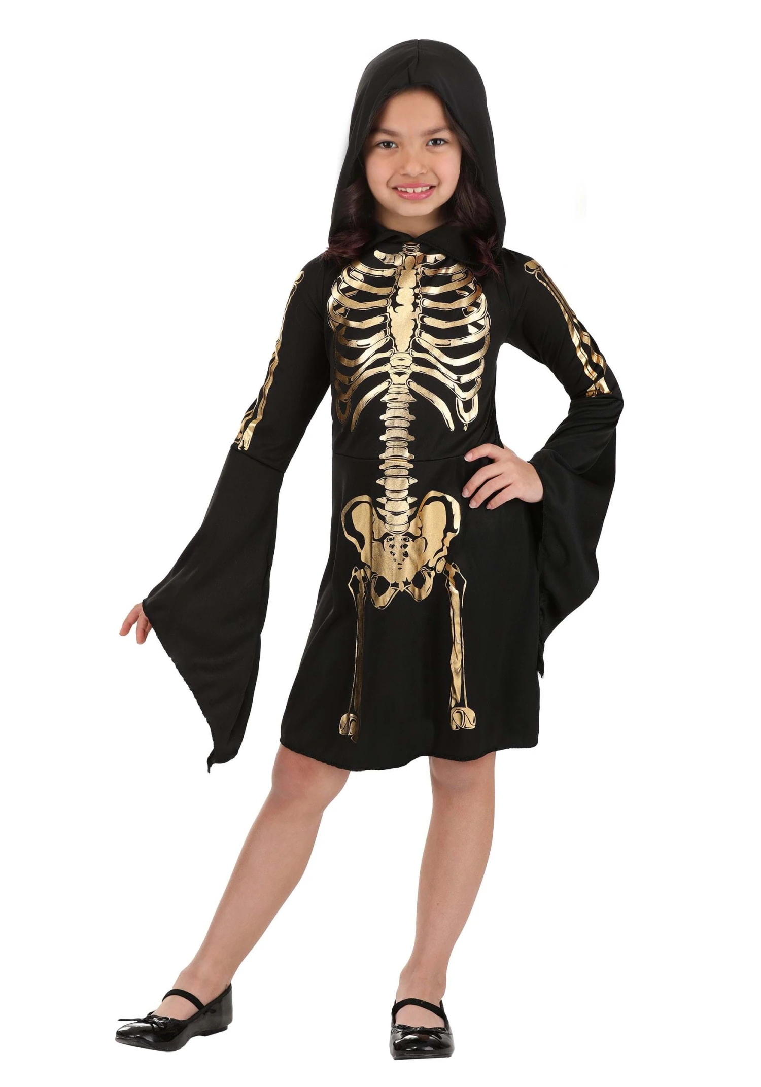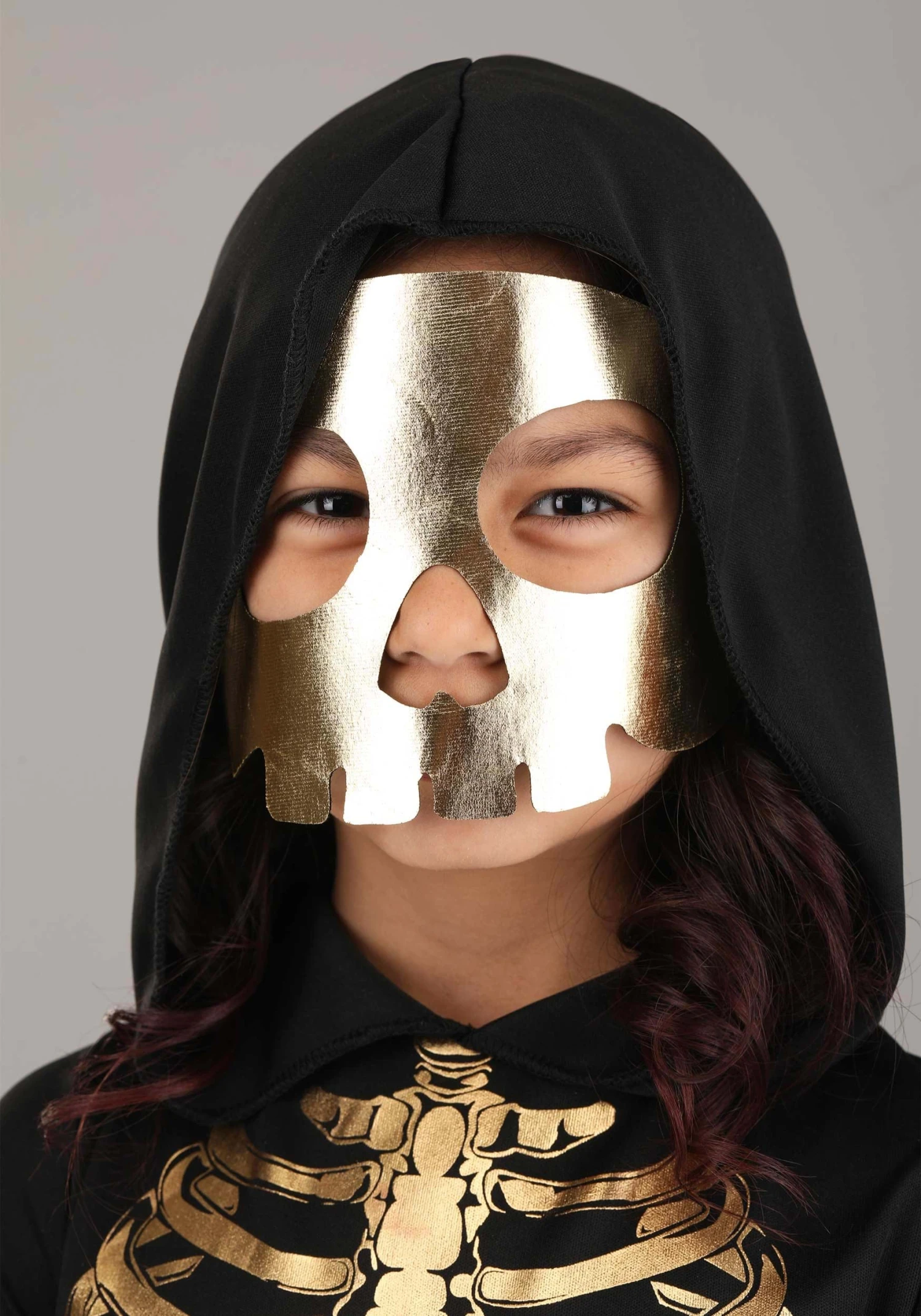 Become a gorgeous ghoul in this exclusive Girl’s Gilded Skeleton Costume Dress! The swingy black pullover dress is made of soft black jersey knit fabric. Elastic is sewn into the back of the waistband to ensure a flattering and comfortable fit. The front of the dress and its flared sleeves are printed with metallic gold skeleton details, including arm bones, spinal bones, a ribcage, pelvic bones, and more. The attached hood comes to a point at the end. Pull it up when you wear the metallic gold faux leather skull mask to conceal your human features.