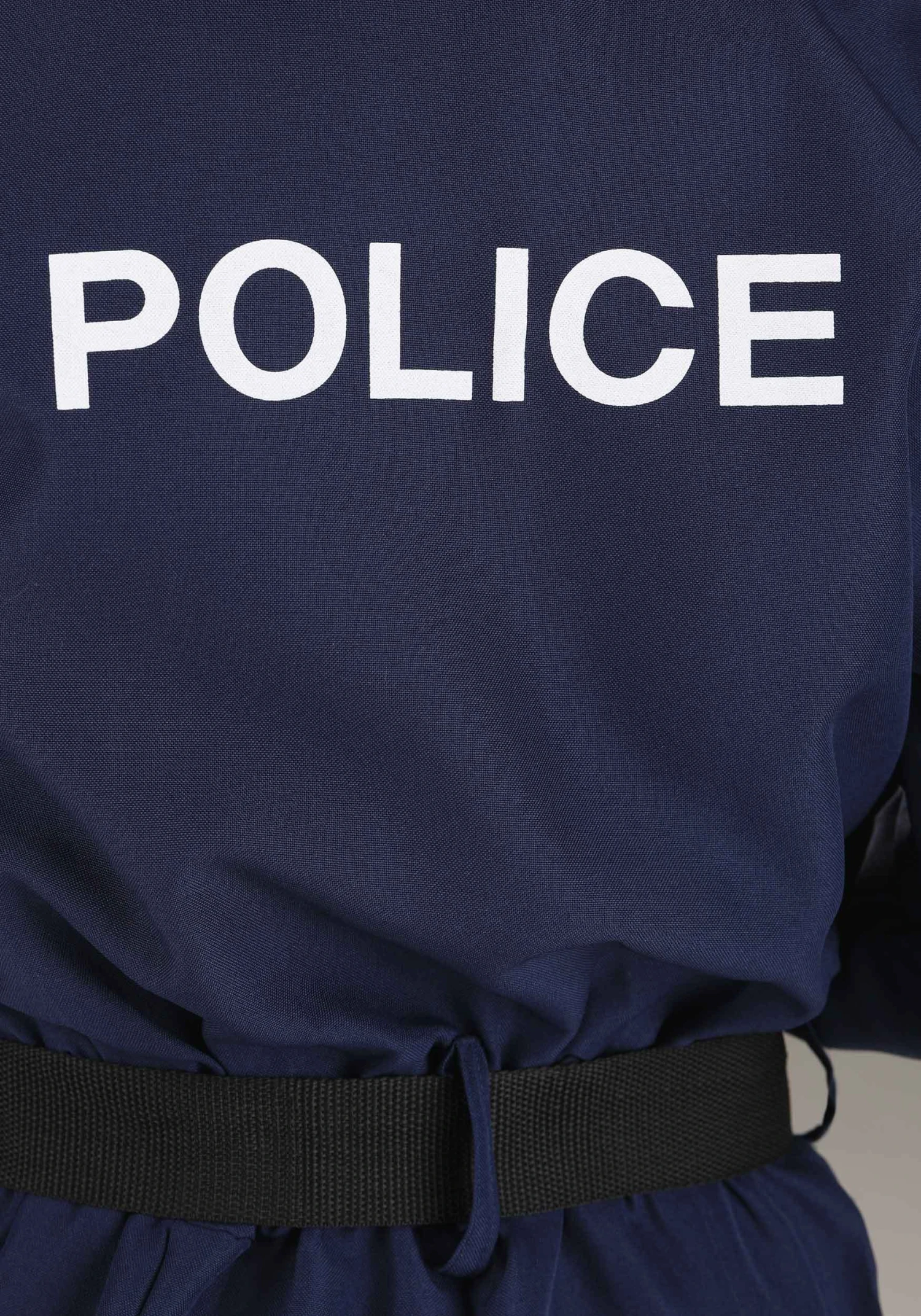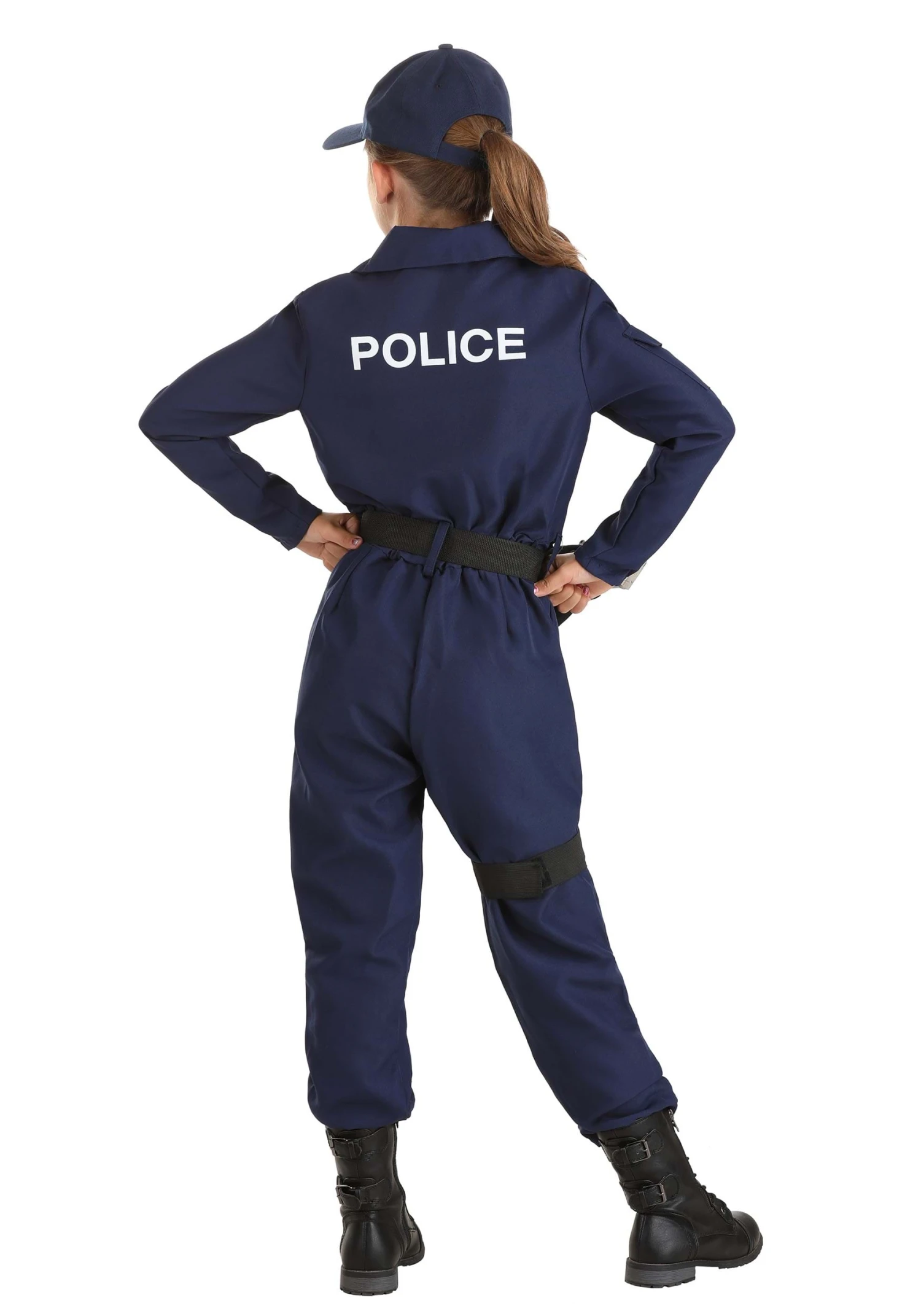 The one-piece navy jumpsuit has a zip up front, along with flap pockets and an embroidered Police logo. The t-shirt also has a matching graphic screen print, as does the hat. Included weapon holsters allow her to bring her toy prop accessories along for the mission (sold separately).