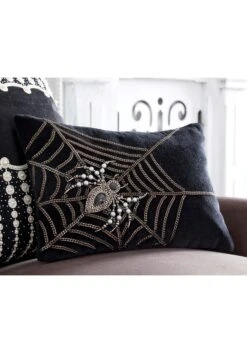 18-Inch Tan Rectangle Decorative Halloween Pillow With Beaded Skeletons