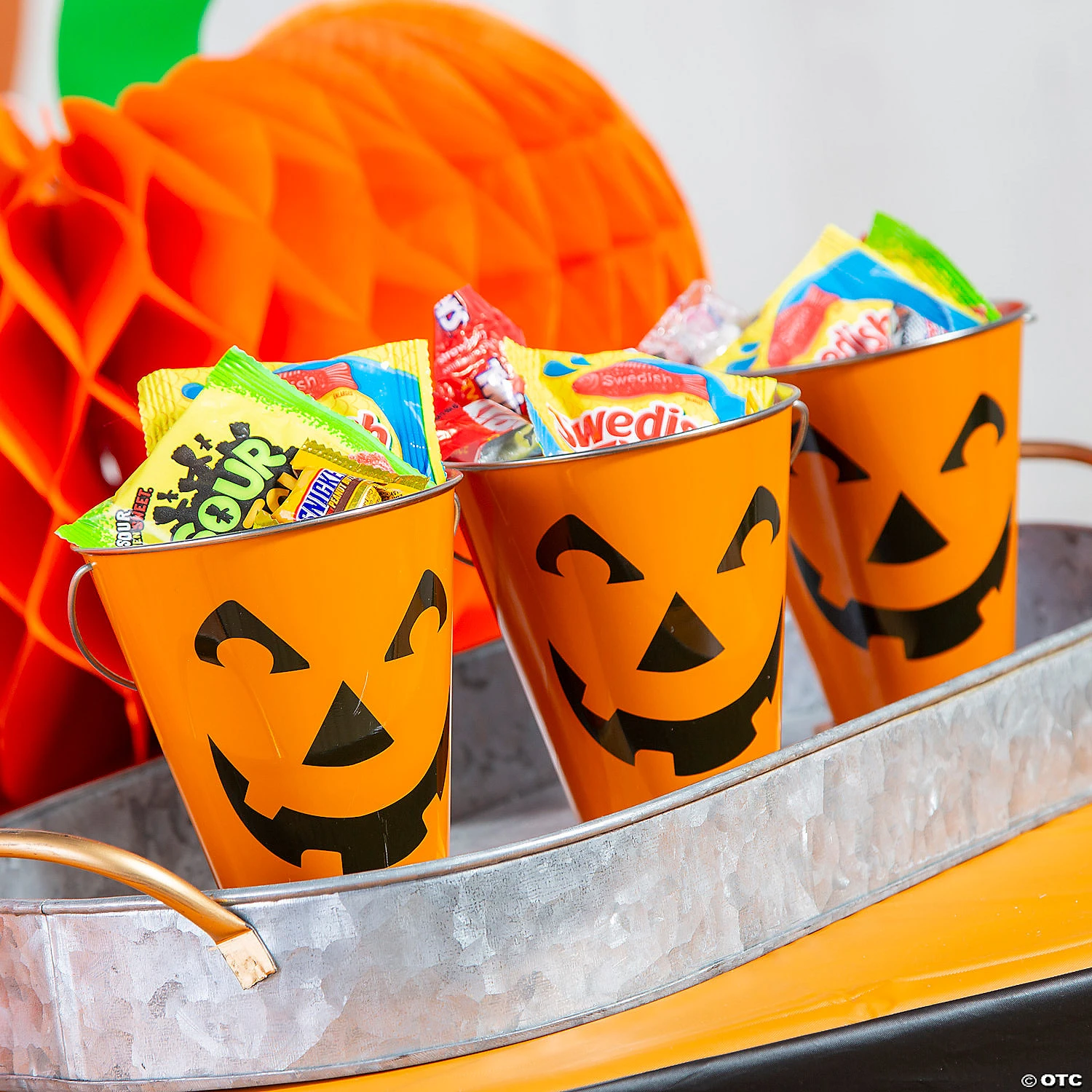 Hand out candy by the bucket with these Jack-O’-Lantern Galvanized Pails! To go above and beyond for your upcoming Halloween events, fill these pails with giveaway toys and candy! Kids will love receiving the extra gift in addition to the traditional Halloween treats. You’ll find even more pumpkin-themed Halloween supplies on our site! Metal. 5″ x 4 1/2″ diam. Not food safe, use wrapped candy only.