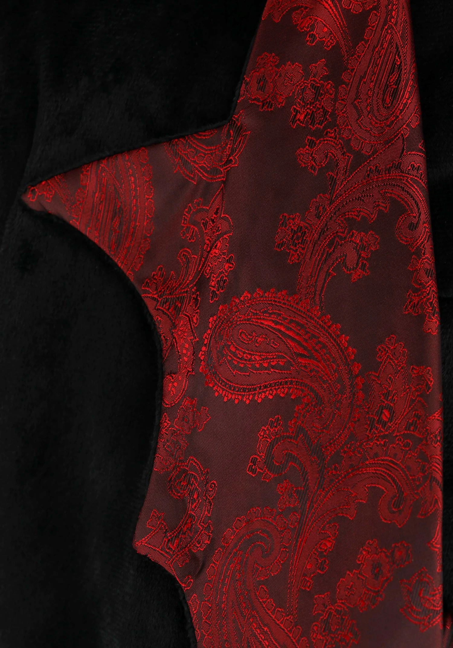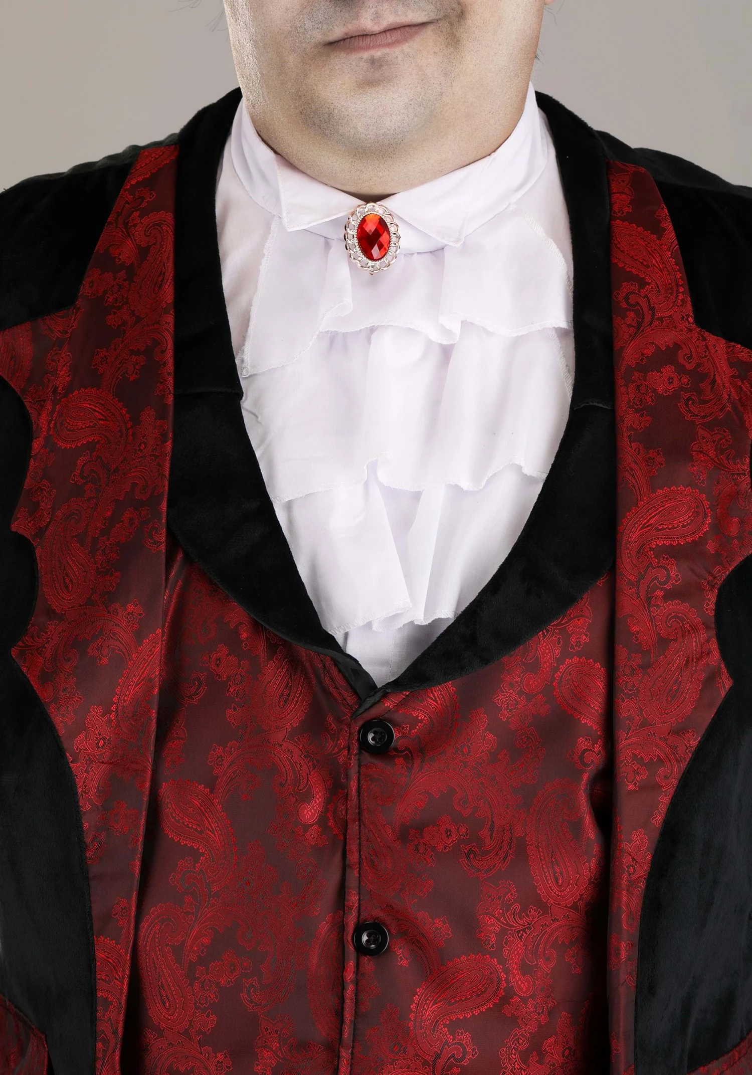 This costume features lush colors with a swirling pattern on the jacket and waistcoat. As it is Made-By-Us this costume has a unique cut and quality that you will want to wear again and again. The jacket has deep cuffs and is accented with ruffles along the sleeves, the chest, and a red jewel at the neck. With the elegance of this costume, you just might find yourself looking up real estate in Western Transylvania.