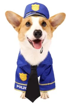 Help your pet achieve his or her whistleblower dreams by giving them this Pet Police Costume! The outfit includes a blue police shirt that slips on over the front paws and fastens under the tummy. It’s decorated with an attached black tie, an embroidered gold badge, gold-tone ribbon detail, and the word “Police” written in white letters across the right cuff. An attached black utility belt holds a prop radio and a pair of handcuffs. A matching blue police hat secures under your pet’s chin with an adjustable band.