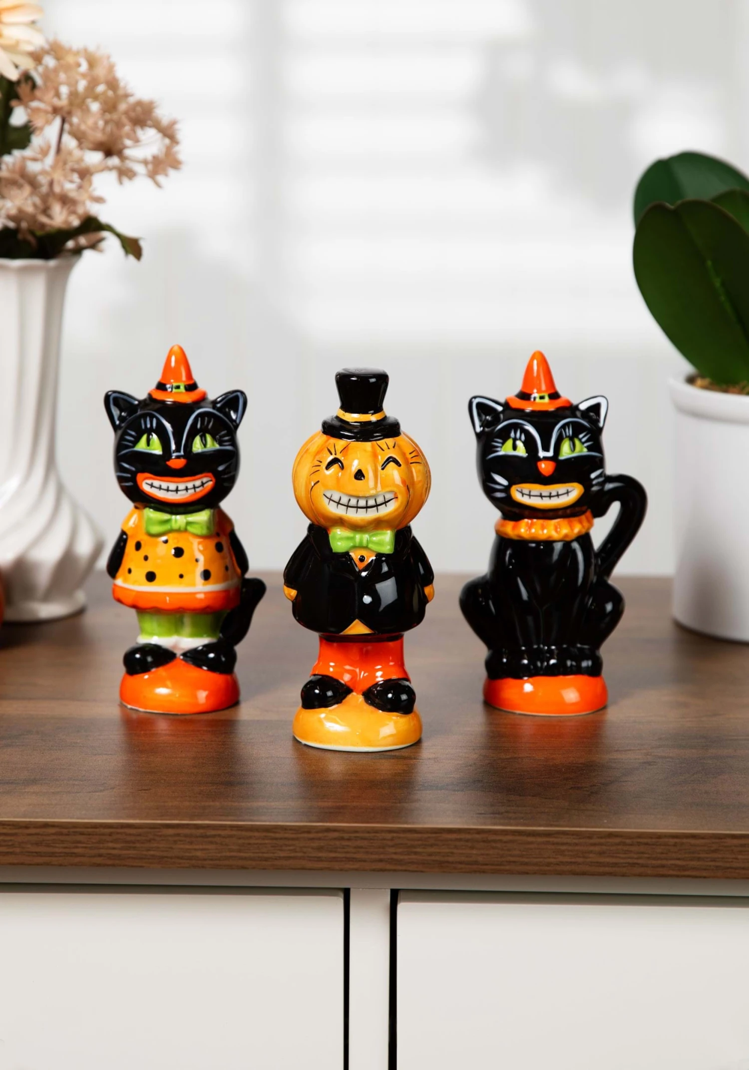 This Set of Three 6 Inch Vintage Inspired Halloween Figures is an eye-catching group! The three resin figurines are brightly painted with retro shades of orange, green, off-white and black. Two are shaped like grinning black cats wearing witch hats, and the third resembles a smiling, pumpkin-headed figure in a top hat and bowtie.