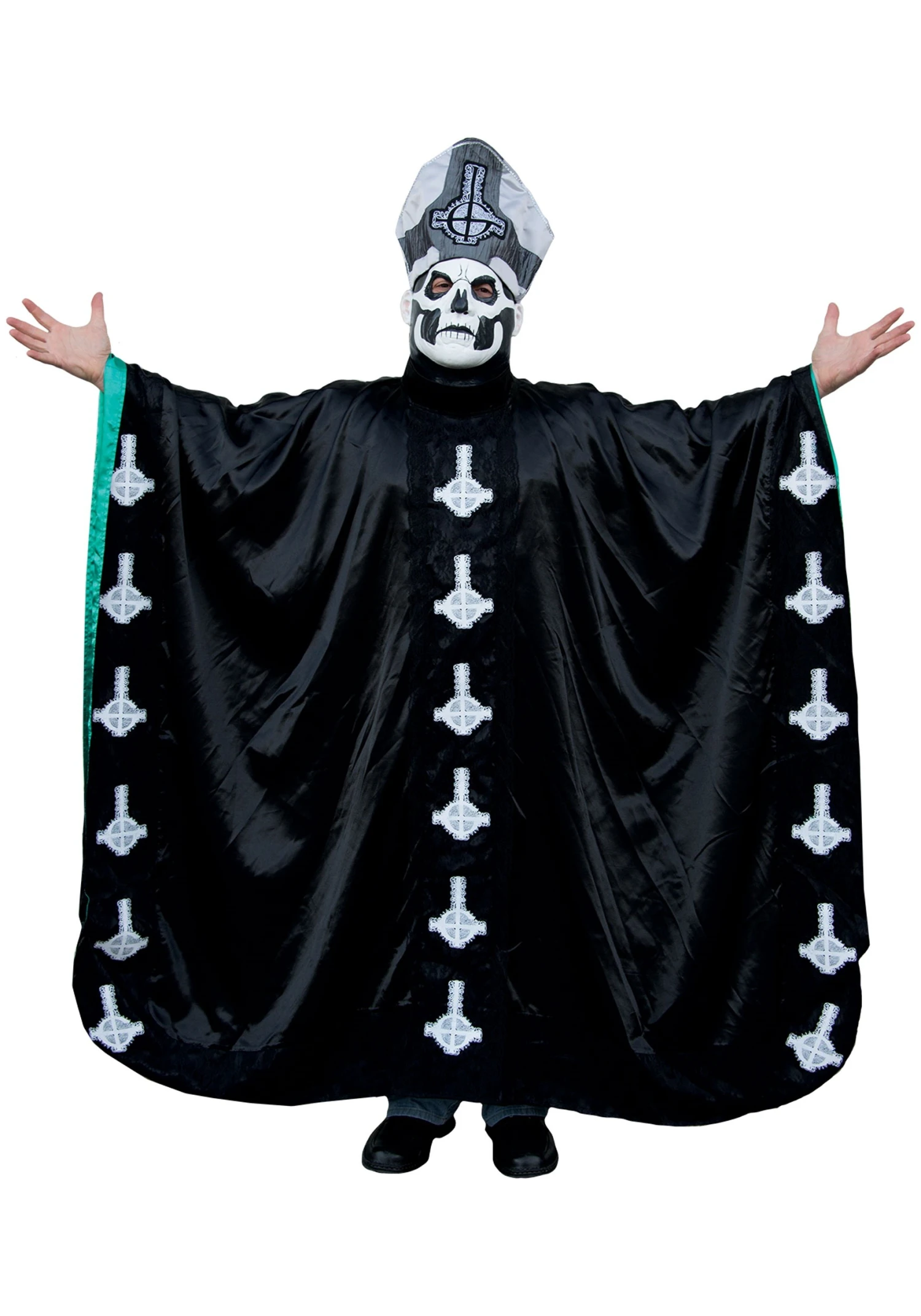 The Ghost Papa costume comes with the highly-detailed robe which is imperative for your transformation. The black, floor-length robe has a shiny finish, creating a chic, wet-look finish. A lace overlay is added to create some texture while the garment fastens behind the neck with a hook and loop fastener. Long, draped sleeves lined with teal edging are inside the robe and are there for your convenience.