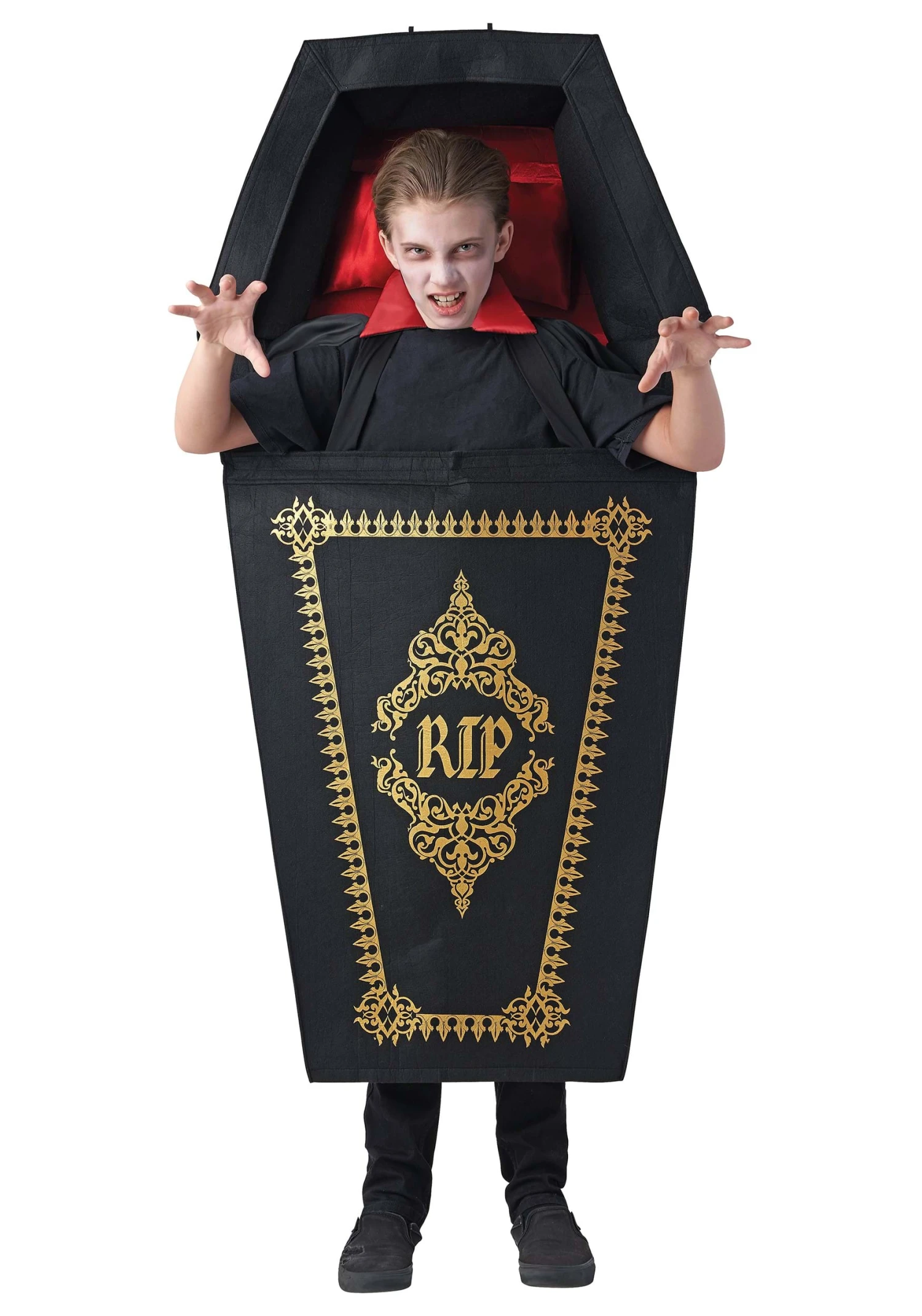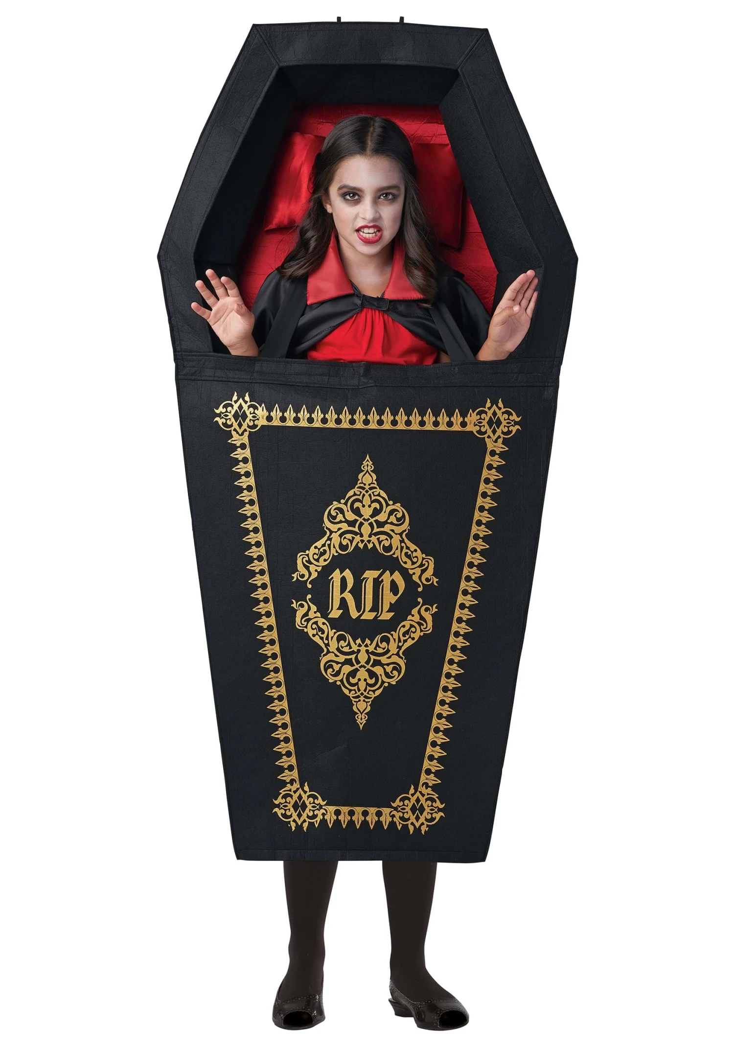 Ever heard of Sleeping Beauty? Well, with this Vampire Casket Costume for Kids, you get to be Sleeping Scary! The unisex costume includes a full-sized yet lightweight tunic shaped to look like a stiff-sided balck coffin. It’s printed with gold detail on the front, including faux embossing and the letters “RIP.” Attached black shoulder straps keep it securely in place, while the red backing makes it look as though you’re resting against a satin coffin interior.