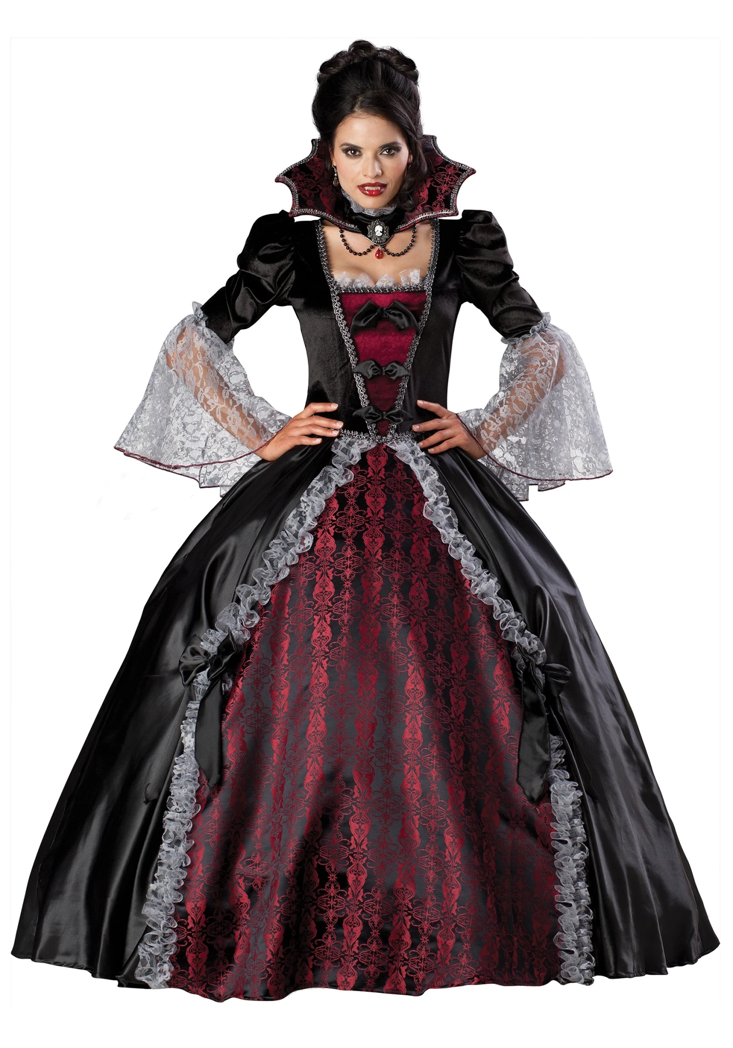 Offer your willing (and fearful) subjects a visage of your glory in this Versailles Vampiress costume. Don the dark gown complete with luxurious black satin bows that run down the front and a black lace petticoat, bowed out as per your elegant style, yet still simple to slip into. Show off the elegant sleeves that hold their place flawlessly thanks to comfortable elastic bands. Complete the look with the subtle reminder of your dark power in the form of a skull cameo choker and of course, some freshly sharpened fangs. Oh, Noble Majesty, have mercy on we simple plebeians!